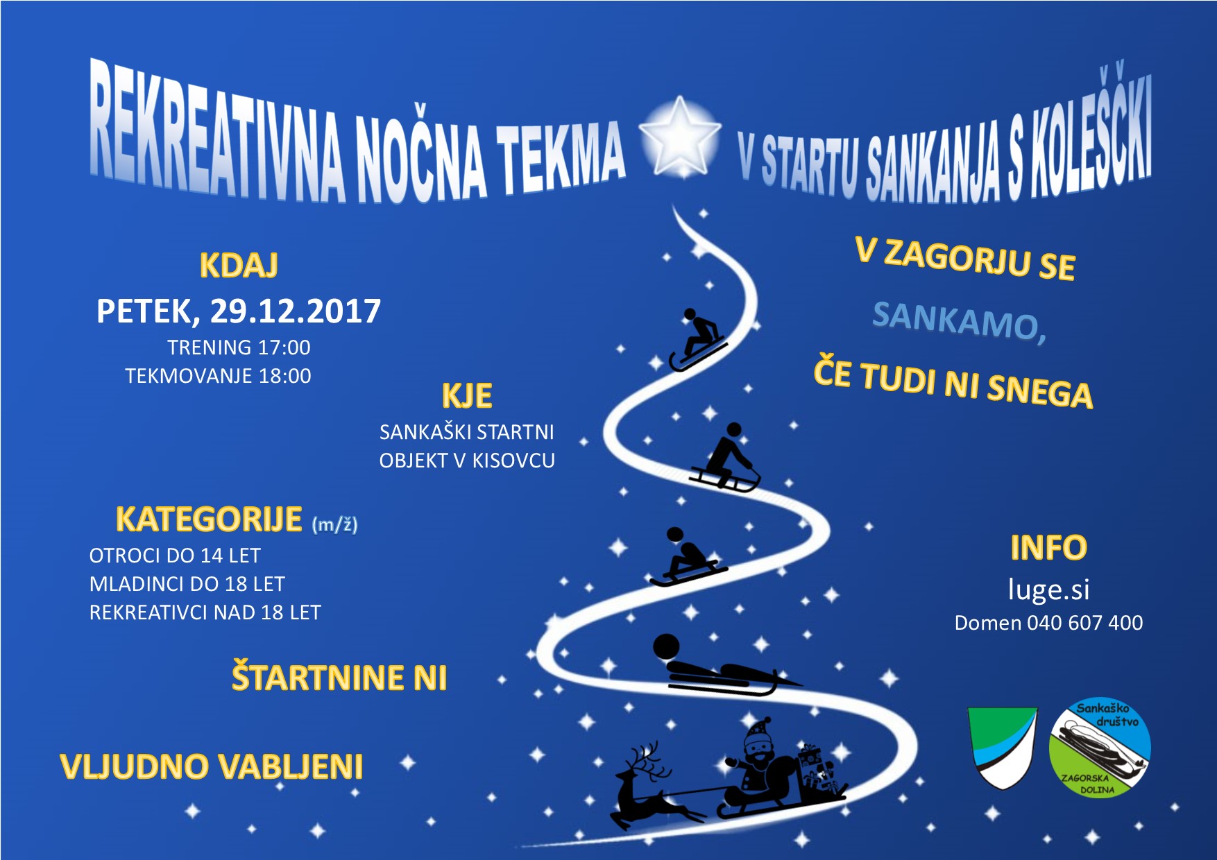 Sankaško društvo ZAGORSKA DOLINA bo v petek, 29.12.2017 organiziral nočno tekmovanje v startu sankanja. VABLJENI